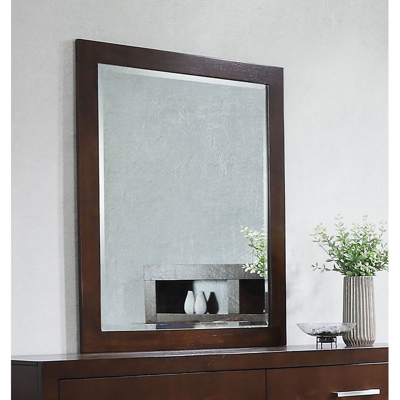 The Jessica collection counts this large mirror as part of its contemporary set. It is built to hang solo on the wall or on a large, sturdy dresser. Beveled glass is bordered by a cappuccino frame. Mirror suits any contemporary bedroom decor. You'll never