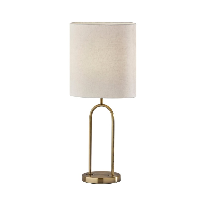 Defined by its sleek, balanced structure and contemporary design, the Joey table lamp is the perfect addition to nightstands, accent tables, or end tables. Featuring a stylish antique brass finish, the 28.5″ tall lamp has a round 7″ base with two thin tubes forming a unique arc design. Topping the lamp is a tall, oval shade made of off-white textured fabric that softly distills the light from a 100W bulb (not included). Operated by a rotary socket switch to easily turn the lamp on or off, it is powered by a 5′ clear cord. Complete your decor with the coordinating Joey floor lamp.