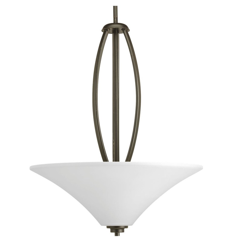 Gleeful simplicity defines this three-light inverted pendant from the Joy Collection. Refreshing and fashionable arcing forms of Antique Bronze metal arms enhance the etched white fluted glass. Coordinating fixtures from this collection let you decorate an entire home with confidence and style. Unique stem-hung construction carries the clean line all the way to the ceiling and, for sloped ceilings, six feet of 9 gauge chain is provided to allow the fixture to hang straight and level.