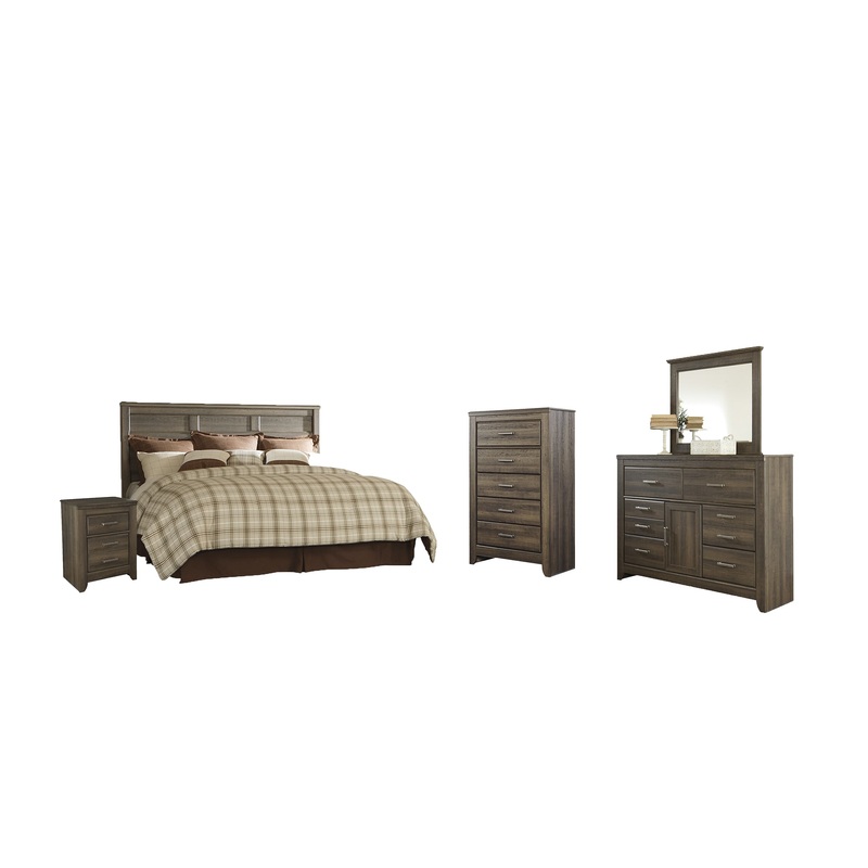 Get the look of posh barn wood without setting foot in a salvage yard. Replicated rough-sawn oak of this 5-piece bedroom set has a vintage finish that is reminiscent of a timeworn family heirloom. Warm, rustic and naturally beautiful, its just got that ageless appeal.