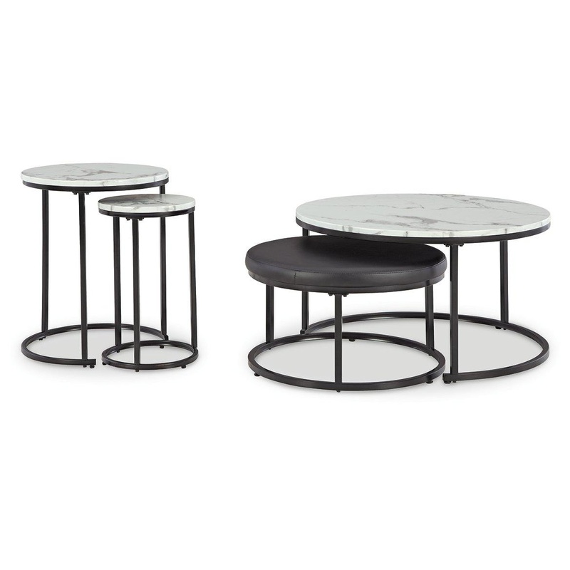 Raise the bar on contemporary form and function with this versatile nesting table set. Its faux Carrara marble tabletops pair with tubular metal frames in a dark finish for a simply chic look that’s so striking. Black faux leather upholstery lends a modern edge to the ottoman, which neatly tucks away under the coffee table. This nesting set brings big style to small spaces.