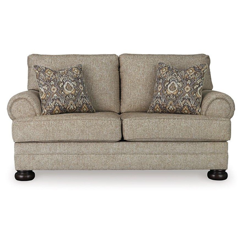 This sumptuously styled loveseat proves that a richly traditional look doesnt have to break the bank. Flared effect gives the classic roll arms a relaxed feel, while the choice of a plush chenille upholstery in oatmeal is earthy elegance at its best. Distinctively turned bun feet in a dark finish add to the loveseat’s substantial presence.