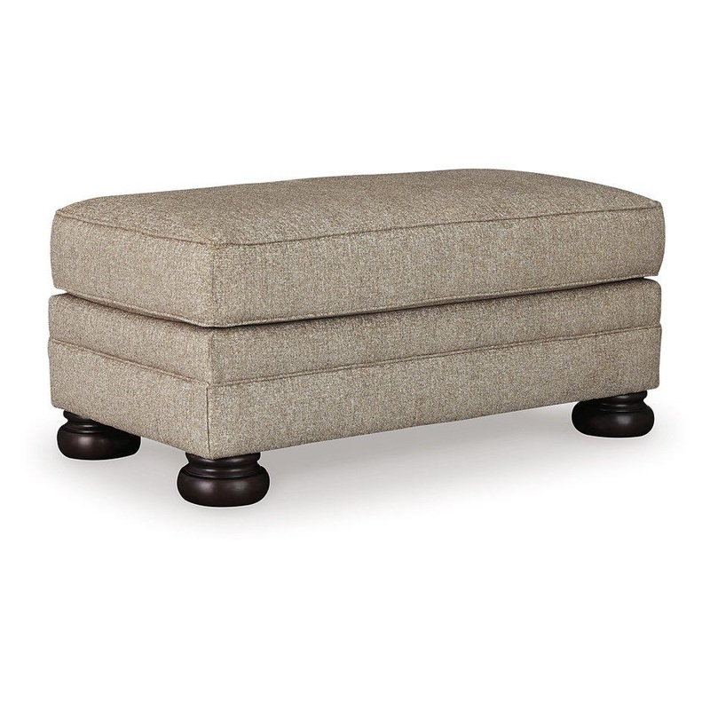 This sumptuously styled ottoman proves that a richly traditional look doesnt have to break the bank. Choice of a plush chenille upholstery in oatmeal is earthy elegance at its best. Distinctively turned bun feet in a dark finish add to the ottomans substantial presence.