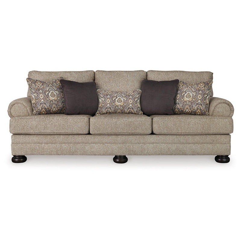 This sumptuously styled sofa proves that a richly traditional look doesnt have to break the bank. Flared effect gives the classic roll arms a relaxed feel, while the choice of a plush chenille upholstery in oatmeal is earthy elegance at its best. Distinctively turned bun feet in a dark finish add to the sofa’s substantial presence.