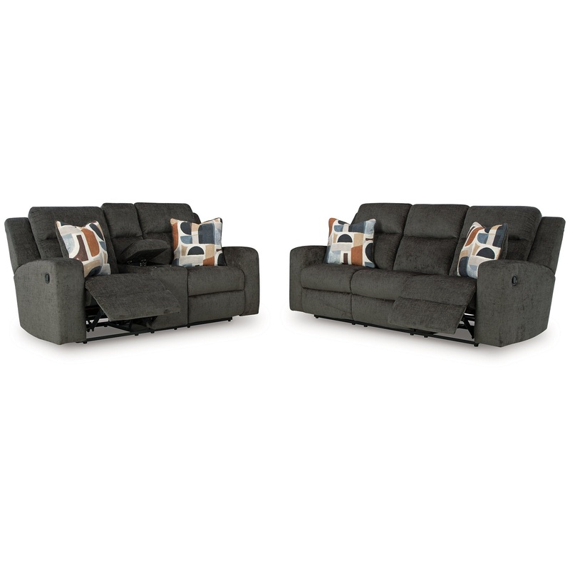 Indulgent comfort meets fashion-forward flair in this seating package. Its luxuriously soft upholstery and captivating color show off your cozy yet smart style. Sleek track arms infuse a modern sensibility, while the striking accent pillows make this set even more inviting. Simple pull tab reclining puts endless relaxation within easy reach.