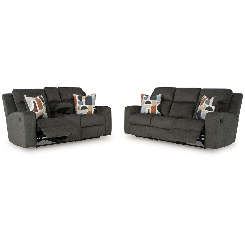 Indulgent comfort meets fashion-forward flair in this seating package. Its luxuriously soft upholstery and captivating color show off your cozy yet smart style. Sleek track arms infuse a modern sensibility, while the striking accent pillows make this set even more inviting. Simple pull tab reclining puts endless relaxation within easy reach.