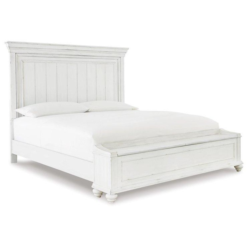 Give your retreat vintage charm with this queen panel bed and storage footboard. In a beautifully distressed whitewash finish, you'll love the headboard's grand style featuring a picture framed panel. The bench footboard is equally elegant offering extra s