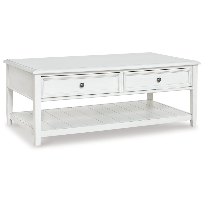 Give your home vintage charm and valuable storage with this stunning coffee table. In a beautifully distressed whitewashed finish, two drawers and a roomy display shelf will help you keep chairside essentials nearby in casual style. Simple farmhouse design evokes the feel of a quaint cottage escape.