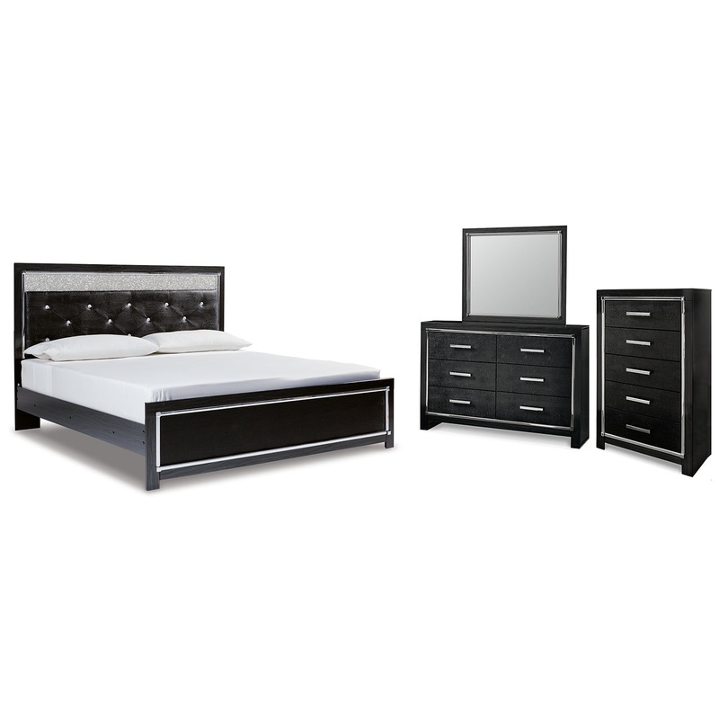 Kaydell King Upholstered Panel Bed with Mirrored Dresser and Chest