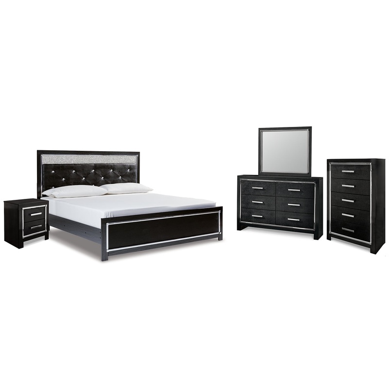Kaydell King Upholstered Panel Platform Bed with Mirrored Dresser, Chest and Nightstand