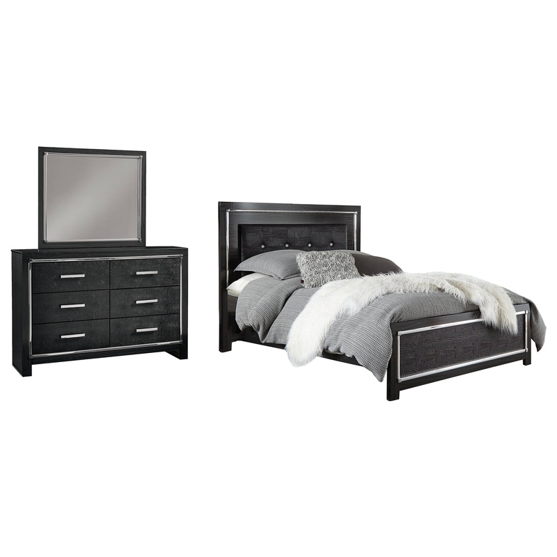 Kaydell Queen Upholstered Panel Bed with Mirrored Dresser