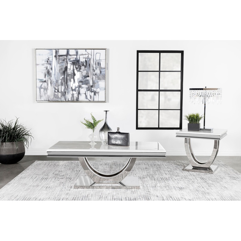 This coffee table set exudes modern glam with sintered stone tops, featuring a marble-like appearance and beveled edges for a luxurious touch. Sweeping demilune pedestal bases, crafted from polished stainless steel, offer sculptural elegance and lasting stability. The contoured molding enhances the sleek, contemporary aesthetic, making this ultra-modern set a timeless and practical addition to refined interiors.