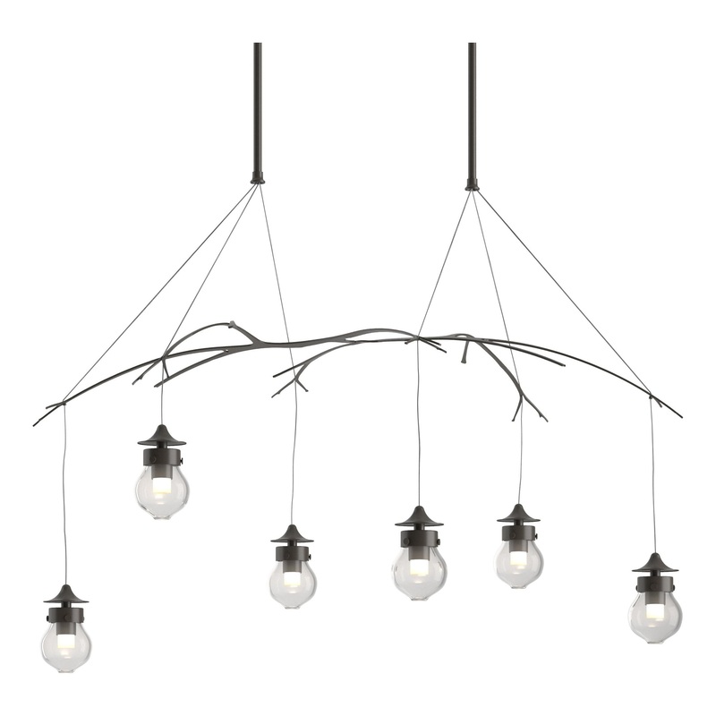 Thick hand blown glass is hung under the Kiwi’s branches of steel. The glow floods the canopy of branches with a warm light highlighting its detail.