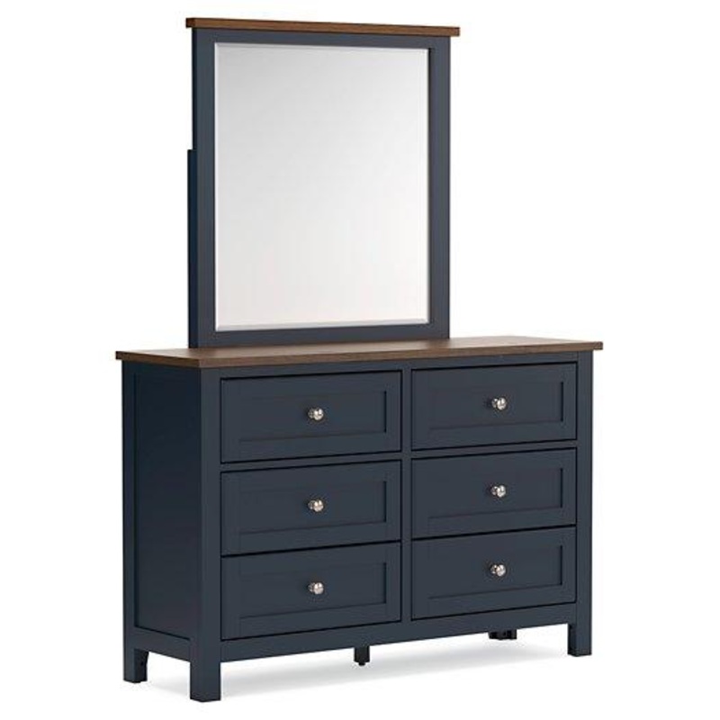 Add homespun charm to your restful retreat. A modern take on a timeless silhouette, this dresser and mirror set pairs a dark slate blue finish with a light brown top. Drawer fronts and legs in a classic Shaker style bring an air of beautiful simplicity to