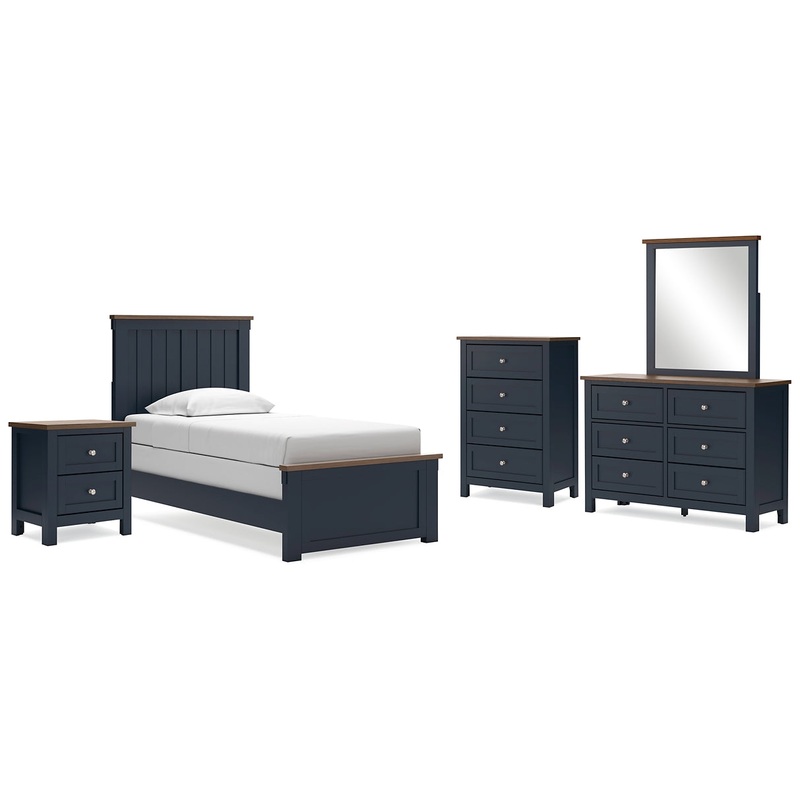 Details B414B2: Includes panel headboard, footboard, rails and slats, Made with hardwood solids, mindi wood veneer and MDF substrates, Two-tone finish features a dark slate blue with a light brown wood-tone top, Foundation/box spring required, sold separately, Mattress available, sold separately, Assembly required, B414B1: Includes dresser and mirror, Made with hardwood solids, mindi wood veneer and MDF substrates, Two-tone finish features a dark slate blue with light brown wood-tone top, Nickel-tone metal knobs, 6 drawers with fully finished interior, dovetail construction and heavy duty ball-bearing side glides, Mirror attaches to back of dresser, B414-45: Made with hardwood solids, mindi wood veneer and MDF substrates, Two-tone finish features a dark slate blue with a light brown wood-tone top, Nickel-tone metal knobs, 4 drawers with fully finished interior, dovetail construction and heavy duty ball-bearing side glides, B414-92: Made with hardwood solids, mindi wood veneer and MDF substrates, Two-tone finish features a dark slate blue with a light brown wood-tone top, Nickel-tone metal knobs, 2 drawers with fully finished interior, dovetail construction and heavy duty ball-bearing side glides,