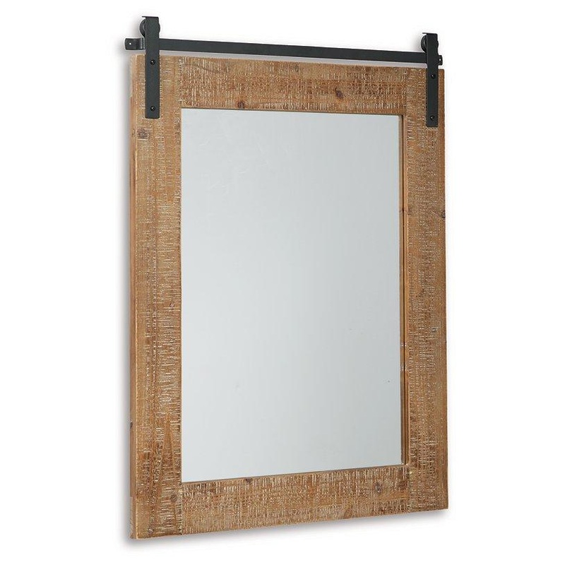 Getting the casual yet complete look you love is a breeze with this accent mirror. With its antiqued brown finished and rough sawn wood, this accent mirror features a black finished metal faux barn door track adding a touch of warmth to any space.
