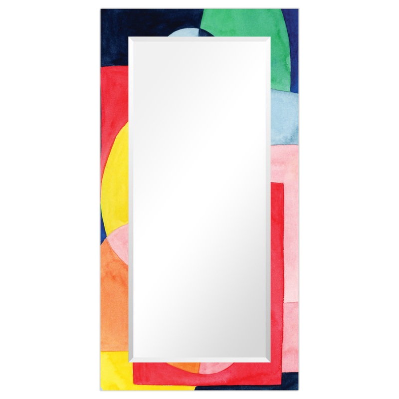 Empire Art Directs collection of printed, frame-less, free floating, tempered glass was inspired by the French technique of Verre Eglomise in which artist’s literally painted the back of clear glass so that when viewed from the front the painting is brought to life under the depth of the glass. This incredible piece by Grace Popp takes that same tempered glass and displays a beveled mirror, centered in front of a beautiful abstract using different shades red, yellow, blue and green. 4 strong steel hangers are attached to the back of the mirror for a quick and easy vertical or horizontal installation.