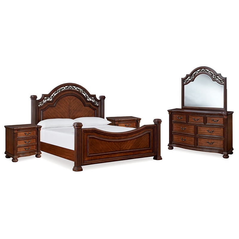 | Details | B764B9: Includes poster headboard/footboard panels, rails and headboard posts, Made with hardwood solids, cherry veneer with MDF substrates, decorative cast resin and furniture grade plastic components , Cherry brown finish, Headboard with metallic accent filigree, Foundation/box spring required, sold separately, Mattress available, sold separately, Assembly required, B764B1: Includes dresser and mirror, Made with hardwood solids, cherry veneer with MDF substrates, decorative cast resin and furniture grade plastic components , Cherry brown finish, Decorative metal drawer pulls with dark bronze-tone finish, 7 drawers with fully finished interior, dovetail construction and ball-bearing side glides, Mirror attaches to back of dresser, B764-93: Made with hardwood solids, cherry veneer with MDF substrates, decorative cast resin and furniture grade plastic components, Cherry brown finish, Decorative metal drawer pulls with dark bronze-tone finish, 2 drawers with fully finished interior, dovetail construction and ball-bearing side glides, Pull-out tray behind bottom drawer, |