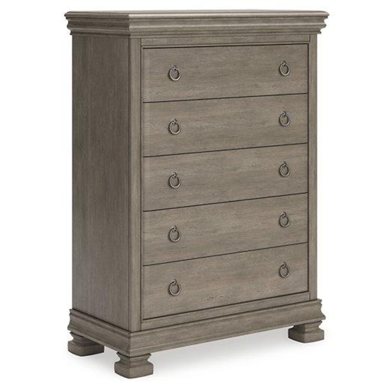 Traditional design motifs, redefined for todays trends. Inspired by timeless Louis Philippe styling, this chest of drawers is distinguished by its stunning attention to detail. Youll find the light gray finish encourages an attitude of laid-back luxury. Complete with spacious storage, it reigns over your bedroom with an air of casual elegance.