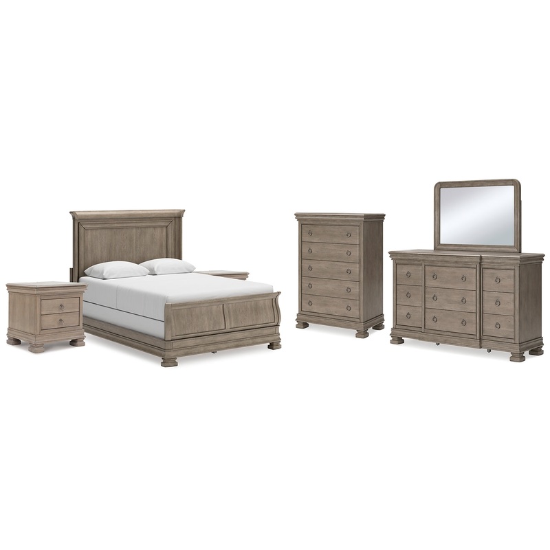 Lexorne Queen Sleigh Bed with Mirrored Dresser, Chest and 2 Nightstands