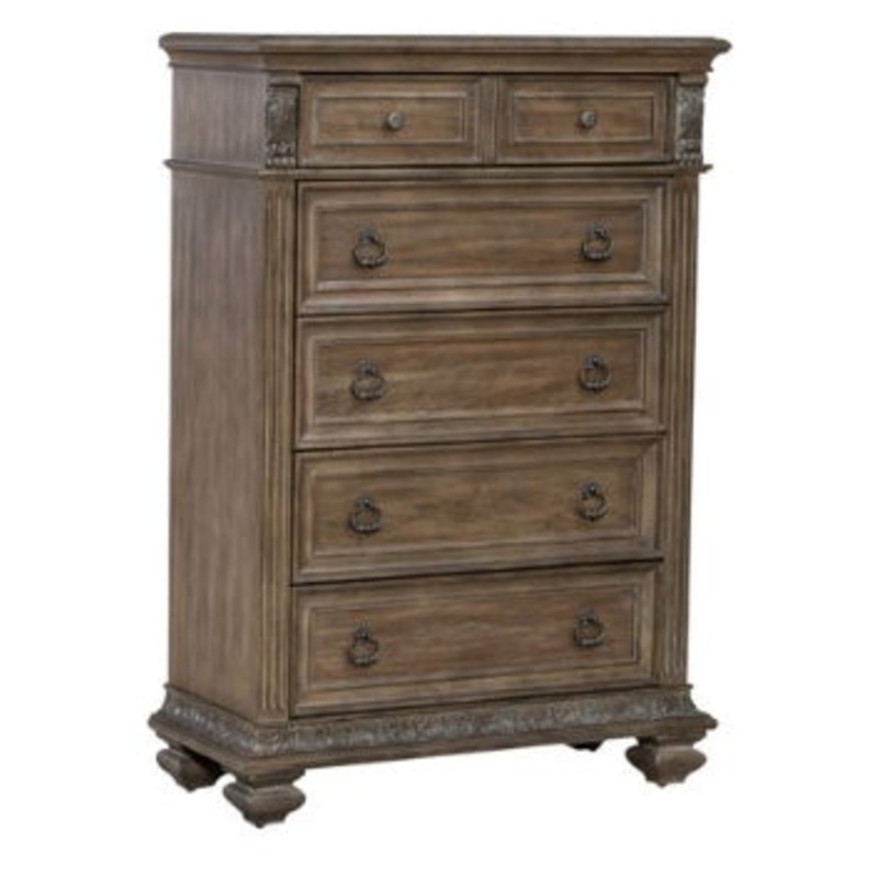 Liberty Furniture Carlisle Court 5 Drawer Chest in Chestnut with Dusty Wax 502-BR41. Indulge in luxury with the Carlisle Court five drawer chest. Crafted with excellence using rubberwood solids and rustic hickory veneers, this chest features a Chestnut with Gray Dusty Wax finish. The chest has carved corbels that accent fluted pilasters. The base showcases acanthus leaf carvings and square turned bun feet. There are five full extension drawers for optimal storage. The top drawer has a bluff-cut drawer front giving the illusion of multiple smaller drawers while still offering deep storage. The drawer fronts are wood framed and feature bead molding for added dimension and are accented with Antique Brass knob and drop ring hardware. The top drawer is felt lined, and the bottom drawer is lined with cedar. Combine the grand feel of the past with today’s luxurious lifestyle with the Carlisle Court five drawer chest.