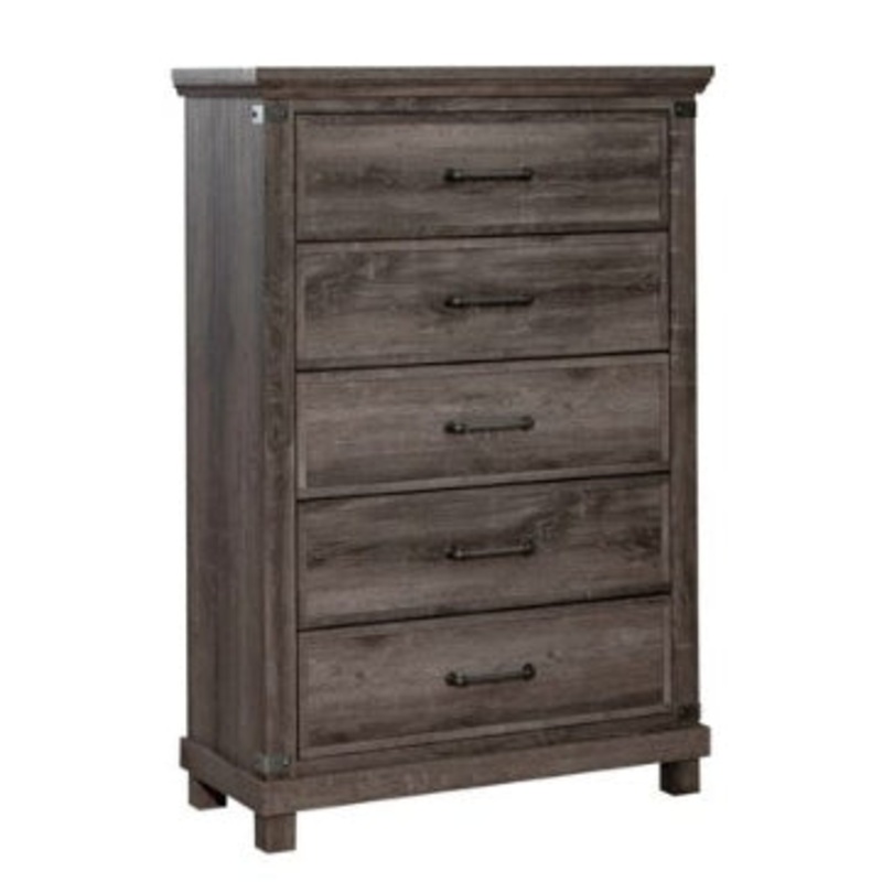 Liberty Furniture Lakeside Haven 5 Drawer Chest in Brownstone 903-BR41. Hit the pause button on your hectic life with the Lakeside Haven five drawer chest. Crafted with excellence using a rubberwood solid frame with 3D Paper Laminate, this piece features a Brownstone finish. Hammered metal corner accent plates along with wood framed drawer fronts and Antique Pewter bar pull hardware add for visual appeal. Clean lines and block feet round out the rustic, cottage look. The urban living design and the rustic charm or cottage appeal of the Lakeside Haven five drawer chest offer style, substance, and handcrafted character.