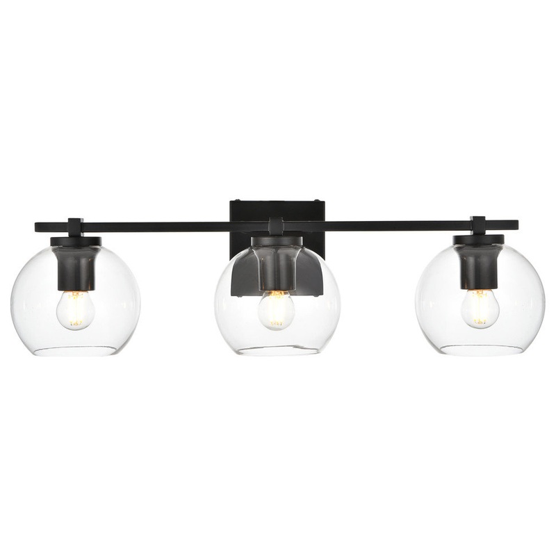 Living District LD7311W24BLK Juelz 3 light Black and Clear Bath Sconce. Collection: Juelz. Finish: Black and Clear. Hardware Finish: Black. Hardware Material: Iron. Fixture Material: Iron and Glass. Dimension(in): 24(W) x 7(H) x 8(Depth) x 8(Ext). Bulb: (3)40W E26 Base(Not Included). Dimmable: YES. Light Direction: down. Max Wattage: 120. Voltage: 110V. Shade Color: Clear. Shade Material: Glass. Shade Dimension(in) : 5.9(W) x 5.2(H)(Included). Shade Shape: Round. Backplate Dimension(in): 4.7(L) x 4.7(W) x 0.8(H)(Included). Wire Included(in): 8. Wire Color: Black and White. Light Direction: down. Dimmable: YES. Assembly Required: Yes. Product Warranty: 1 year limited. Dry/Wet/Damp Location: Damp. ETL: yes. California Proposition 65 Warning Required: Yes. Prop 65 Chemical Name: LEAD.