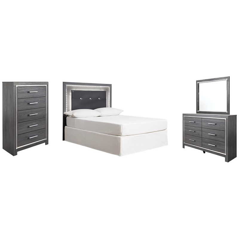 Details B214-46: Made of engineered wood (MDF/particleboard) and decorative laminate, Gray finish with replicated wood grain, Faceted chrome-tone pulls and accents, 5 smooth-operating drawers, Drawer interiors are lined with a faux linen laminate for a clean, finished look, Safety is a top priority, clothing storage units are designed to meet the most current standard for stability, ASTM F 2057 (ASTM International), Drawers extend out to accommodate maximum access to drawer interior while maintaining safety, B214-87: Made of engineered wood (MDF/particleboard) and decorative laminate, Gray finish with replicated wood grain, Faux leather upholstery, Faux crystal and faceted chrome-tone metal accents, Accent LED lights with remote to control color and brightness, Included remote holder keeps remote for lights discreet and accessible, Hardware not included, ” bolts are needed to attach headboard to existing metal bed frame, Capable of attaching to a full sized metal bolt-on bedframe, Power cord included; UL Listed, Mattress and foundation/box spring available, sold separately, Assembly required, B214B1: Made of engineered wood (MDF/particleboard) and decorative laminate, Gray finish with replicated wood grain, Faceted chrome-tone pulls and accents, 6 smooth-operating drawers, Drawers lined with faux linen laminate, Mirror attaches to back of dresser, Includes tipover restraint device, Assembly required,