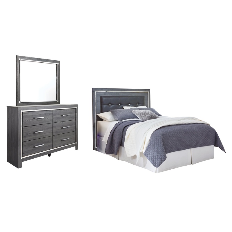 Details B214-57: Made of engineered wood (MDF/particleboard) and decorative laminate, Gray finish with replicated wood grain, Faux leather upholstery, Faux crystal and faceted chrome-tone metal accents, Accent LED lights with remote to control color and brightness, Included remote holder keeps remote for lights discreet and accessible, Hardware not included, ” bolts are needed to attach headboard to existing metal bed frame, Capable of attaching to a full sized metal bolt-on bedframe, Power cord included; UL Listed, Mattress and foundation/box spring available, sold separately, Assembly required, B214B1: Made of engineered wood (MDF/particleboard) and decorative laminate, Gray finish with replicated wood grain, Faceted chrome-tone pulls and accents, 6 smooth-operating drawers, Drawers lined with faux linen laminate, Mirror attaches to back of dresser, Includes tipover restraint device, Assembly required,