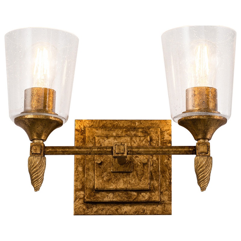 Inspired by 1950s and ’60s design, the antique gold finish and double square backplate of our Vetiver two-light wall sconce adds charming style to bathrooms, living rooms and favorite reading spots . The simple clear seeded glass and the detailed gold finial complete the look of this new 2-light vanity bath bar.