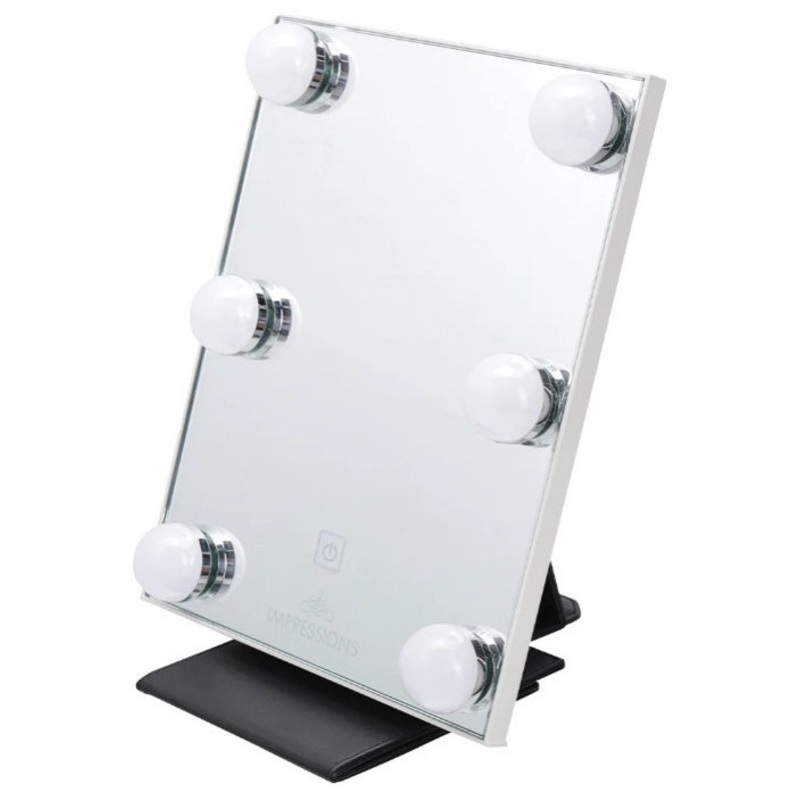 Impressions Vanity Touch Infinity XL LED Makeup Mirror with illuminated light and portable feature. This lighted makeup mirror has energy saving bright LED strip lights, which are activated and dimmable via a touch power sensor. The base includes a storage