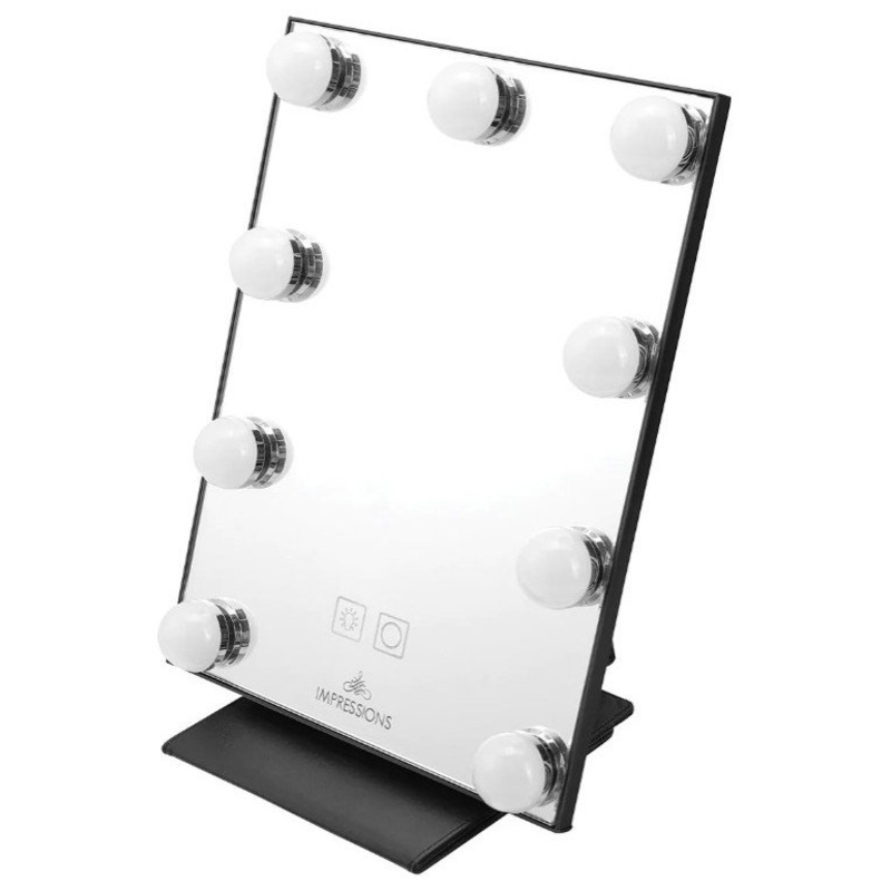 Impressions Vanity Lumiere Touch Pad Pro tabletop lighted makeup mirror with LED Lights. A travel friendly lighted makeup mirror with a premium and stylish faux crocodile leather cover thats detachable and foldable converting into a mirror stand. This rose gold vanity mirror with lights is equipped with a tough aluminum frame and a durable anodized finish. So this makeup mirror for vanity doesnt slow you down on your travel. You can turn your hotel bathroom into your personal beauty studio with this personal light up makeup mirror. This small rectangular mirror includes LED strip lights and a crystal clear view of your entire face and hair, giving you ideal viewing for makeup and other integrated activities. You can dimmer this multi functional smart mirror with a touch sensor switch to adjust the lights brightness. so that you can create the correct makeup looks depending on where you will be going next.