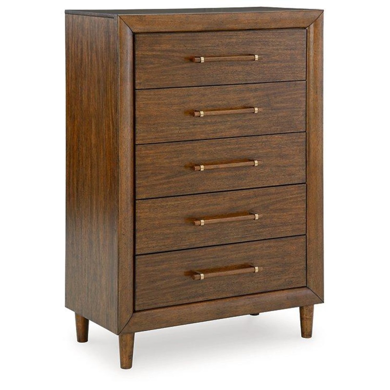 This chest of drawers is perfect for contemporary or mid-century interiors. Its wood-tone finish is versatile and timeless. The drawers, designed with exquisite framing and elongated wooden pulls, enhance the overall aesthetic. Whether you want to refresh your entire bedroom or add a few key pieces, this is the ideal choice.