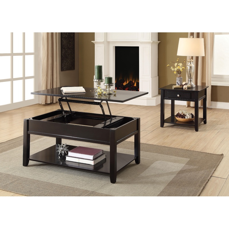 ACME Malachi Coffee Table w/Lift Top, Black, 40″ x 24″ x 19″H, 75lbs. Features: – Coffee Table w/Lift Top (Faux Drawer) – Open Storage: Bottom Shelf – Lift Top with 2 Storage compartments (Spring: Lifts up & Slide to the larger side) – Wooden Top & Apron: Faux Drawer – KD, Wooden Square Leg & Shelf Materials: Wood, Wood Veneer, Composite Wood