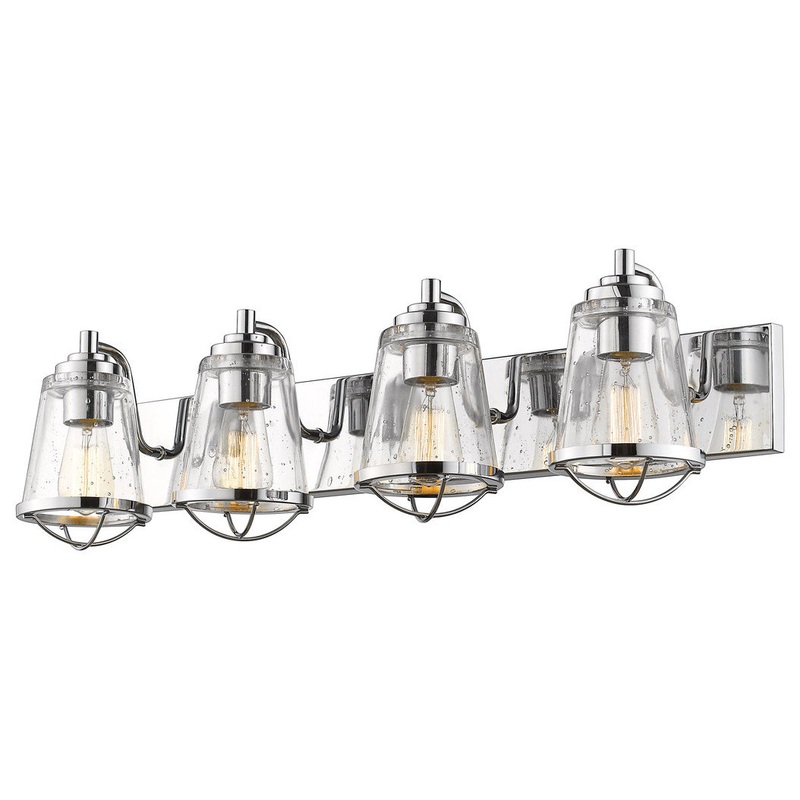 Borrowing from a beloved nautical motif, the uplifting style of this four-light vanity fixture becomes an integral part of a master or guest bath design scheme. Luscious, shiny chrome metal provides a mount and ornate trim detailing for conical shades made from texture-rich seedy glass.