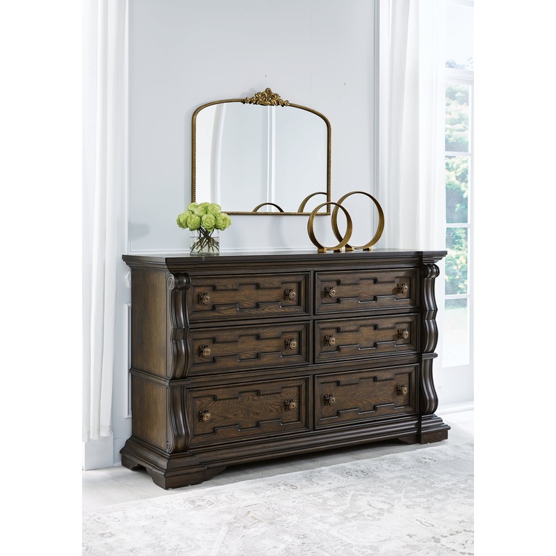 From its ornamental appliques to its large scale, this dresser makes a bold statement. Spacious drawers store your clothes, jewelry and more in stunning style. The look is timeless. The feel? Right at home.