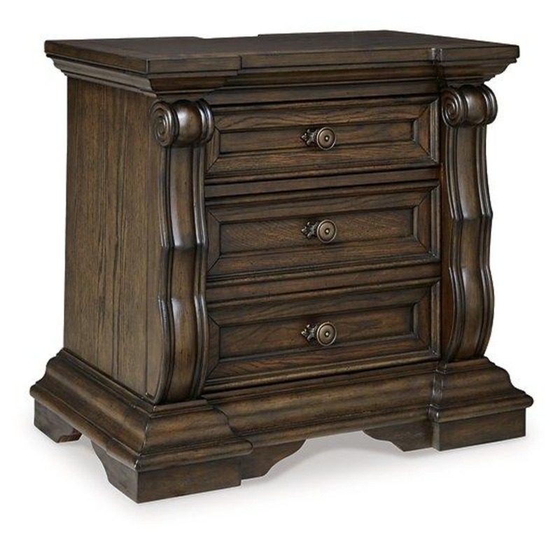 From its ornamental appliques to its large scale, this nightstand makes a bold statement. Spacious drawers store your bedtime essentials in stunning style. A hidden pull-out tray behind the bottom drawer puts your small valuables out of sight. The look is timeless. The feel? Right at home.