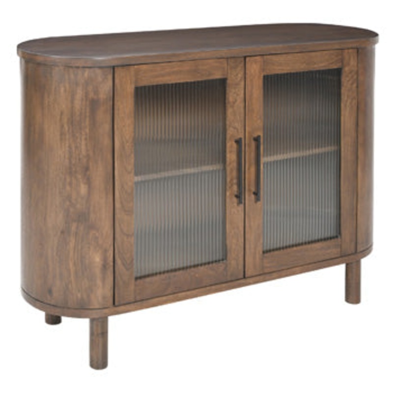 A masterclass in casual design, this accent cabinets capsule shape strikes a superbly fluid pose. Behind wood-framed doors with fluted glass inserts and black metal door pulls, youll find a fixed shelf for simple and streamlined storage. Functional and fab