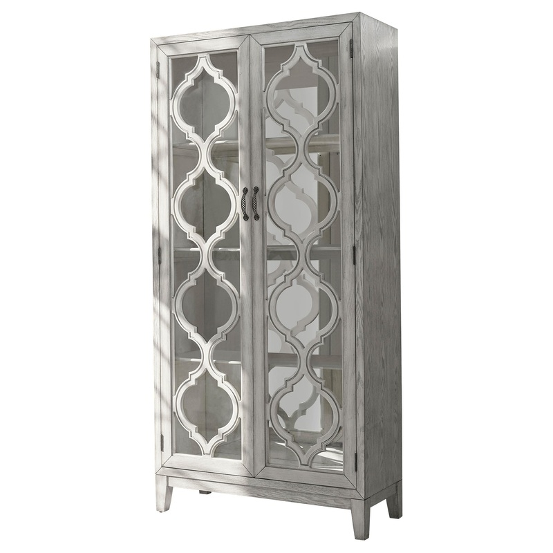 Showcase your cherished items in this striking display cabinet, crafted with intricate lattice wood overlay and mirrored back panels for added depth and elegance. Framed glass doors open to reveal three shelves ideal for displaying collectibles or dinnerware. Finished in a soft ash tone, this cabinet brings vintage charm and refined style to any space