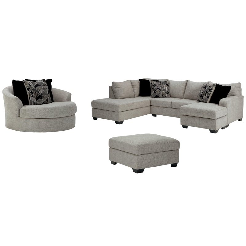 As much as you love clean-lined, modern furniture, you want to keep the vibe relaxed and comfortable. Rest assured, this living room set has that look and feel mastered. Perfect for fashion-forward family rooms, where everyone is welcome to kick back, this designer ensemble with 2-piece sectional, chair and ottoman will win everyone over with its spacious, sumptuous seating. Richly textured, with specks of black and white peeking through, the storm gray upholstery is chic and sophisticated.