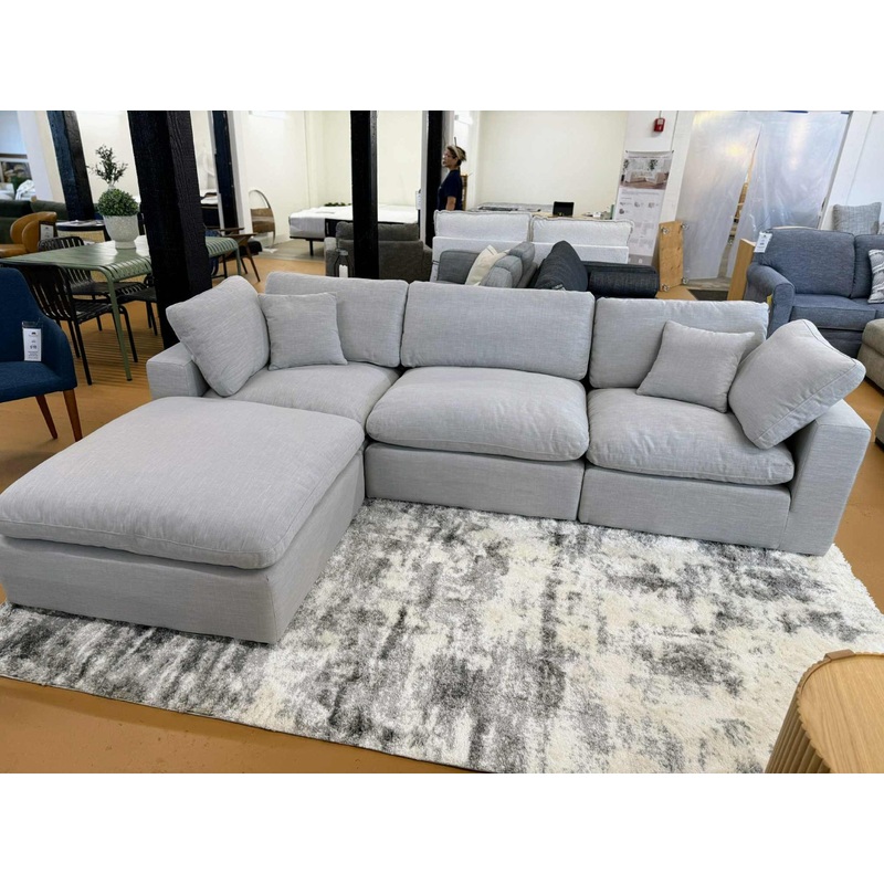 This is a Meridian 4 piece Comfy 119″ Modular Sectional with light gray textured linen fabric.