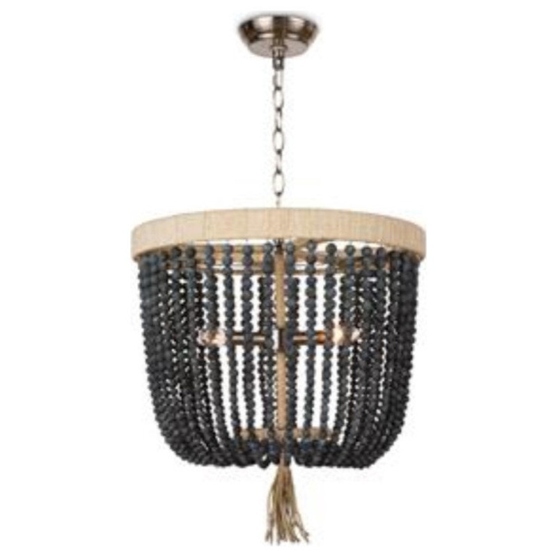 Round denim blue beads form the dynamic shade of the Milos chandelier, whose frame is wrapped with natural rope and accented with a rope tassel finial. A antique brass finish on the hardware further warms the feel. Install this in a kitchen or dining room