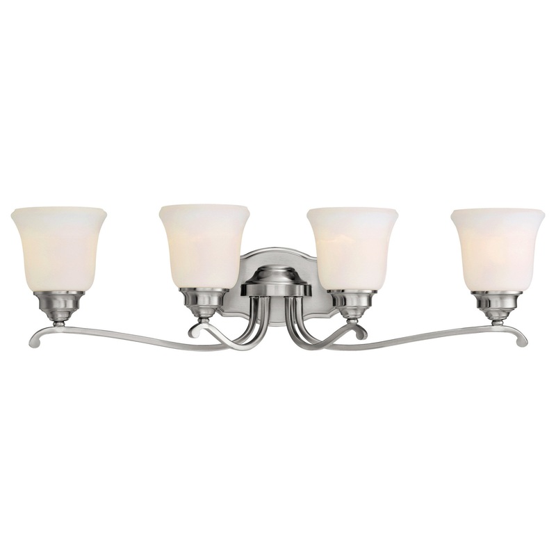 Four Light Vanity Light from the Savannah Row Collection Product Features: Etched glass shade offer creative patterns and designs Requires (4) 100 watt Medium (E26) base bulbs Product Dimensions: Height: 8.25″ Width: 31″ Extension: 8.25″ Backplate Height: 5″ Backplate Width: 8.5″ Weight: 5.75 lbs Electrical Specifications: Bulb Base: Medium (E26) Bulb Included: No Number of Bulbs: 4 Wattage: 400 Watts Per Bulb: 100 Compliance: UL Listed – Indicates whether a product meets standards and compliance guidelines set by Underwriters Laboratories. This listing determines what types of rooms or environments a product can be used in safely.