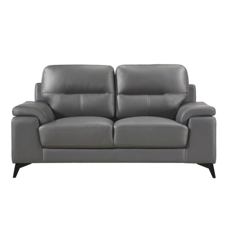 Styled for the modern home, the Mischa Collections love seat blends the luxurious feel of leather with the comfort of plush seating. The dark gray top grain leather cover, with faux leather, enhances the sleek profile of the collection. Contoured pillow-to
