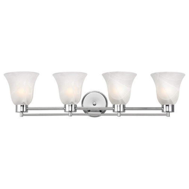 Modern chrome 4-light bathroom light with bell glass shades. Takes four 100-watt medium base frosted light bulbs (not included). Suitable for installation in dry and damp locations. This bathroom light can be installed with the glass facing up or down. A s
