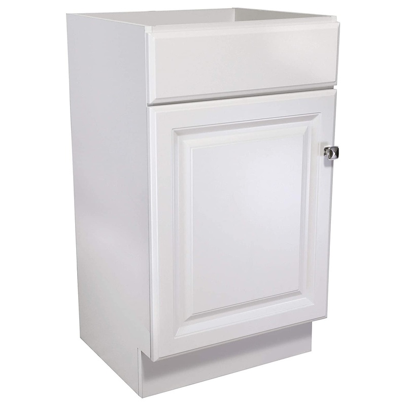 The Vanity without Top features a durable white finish and satin nickel square knob hardware. Perfect for any style home, this vanity has clean lines and concealed hinges. The 1-door construction gives you plenty of storage for toiletries to keep your countertop free of clutter. The door opens with a fluid motion, does not whine or creak and can endure moderate stress. Measuring 18-inches by 16.25-inches by 31.5-inches, this vanity can fit into a small bathroom. The frameless design provides ample storage and accessibility to store toiletries for the entire family. Traditional construction meshes with subtle modern details to quickly brighten up your bathroom. This product is perfect for remodeling your bathroom and matches granite countertops and colored walls.