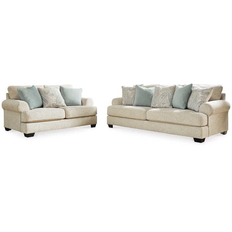 This sofa and loveseat strike a beautiful balance between classic and current. Traditional elements include t-cushion seating and setback roll arms, angled for modern flair. Posh collection of pillows in spa mist and jacquard paisley make a muted, mellow complement to the sofas casual textured chenille upholstery. Choice of sandstone beige is a light and lovely style awakening.
