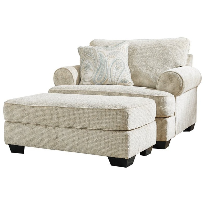 This oversized chair and ottoman strike a beautiful balance between classic and current. The oversized chairs traditional elements include t-cushion seating and setback roll arms, angled for modern flair. Jacquard paisley pillows make a muted, mellow complement to the chairs casual textured chenille upholstery. Choice of sandstone beige is a light and lovely style awakening.