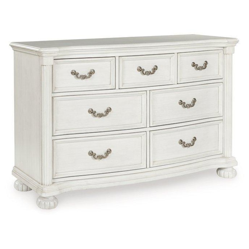 Transform your inner sanctum into a haven of timeless elegance and functionality. This traditionally styled dresser is adorned in a classic antiqued white finish, highlighted by a serpentine-shaped front with thick decorative moulding. Its drawers are pack