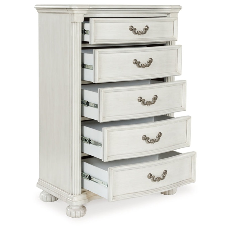 | Details | Made with hardwood solids, veneer and MDF substrate with cast resin components, Antiqued white finish, Metal pulls with polished pewter-tone finish, 5 smooth-gliding drawers with fully finished interiors, Drawers with French/English dovetail construction and heavy-duty ball-bearing side glides (top drawer felt lined), Thick decorative moulding, Reeded bun feet |